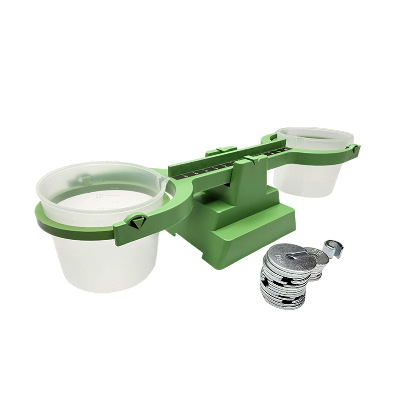 The simple balance consists of 1 base, 1 crossbeam, 2 tray tubes (200mL plastic measuring tube), 1 sliding weight, 8 20g weights, and 4 10g weights. The main parts of the simple balance are made of engineering plastics